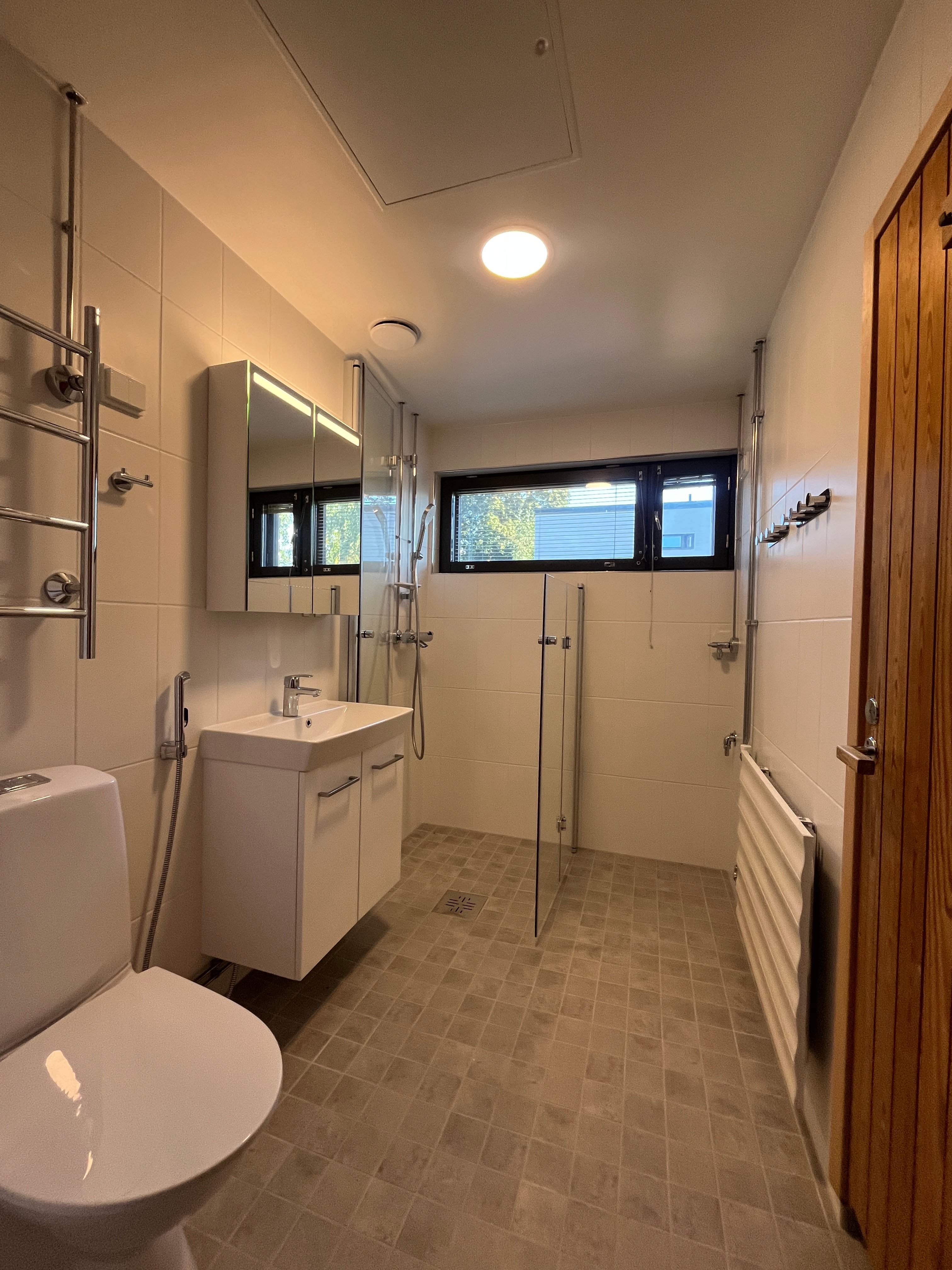 Laatoitetussa kylpyhuoneessa on hana/pesuallas, peili, seinävalaisin, suihku, amme, WC-istuin, tuuletusikkuna ja pesukoneliitäntä (+tila pesutornille). Kylpyhuone on remontoitu keväällä 2025 alkaneen linjasaneerauksen yhteydessä.