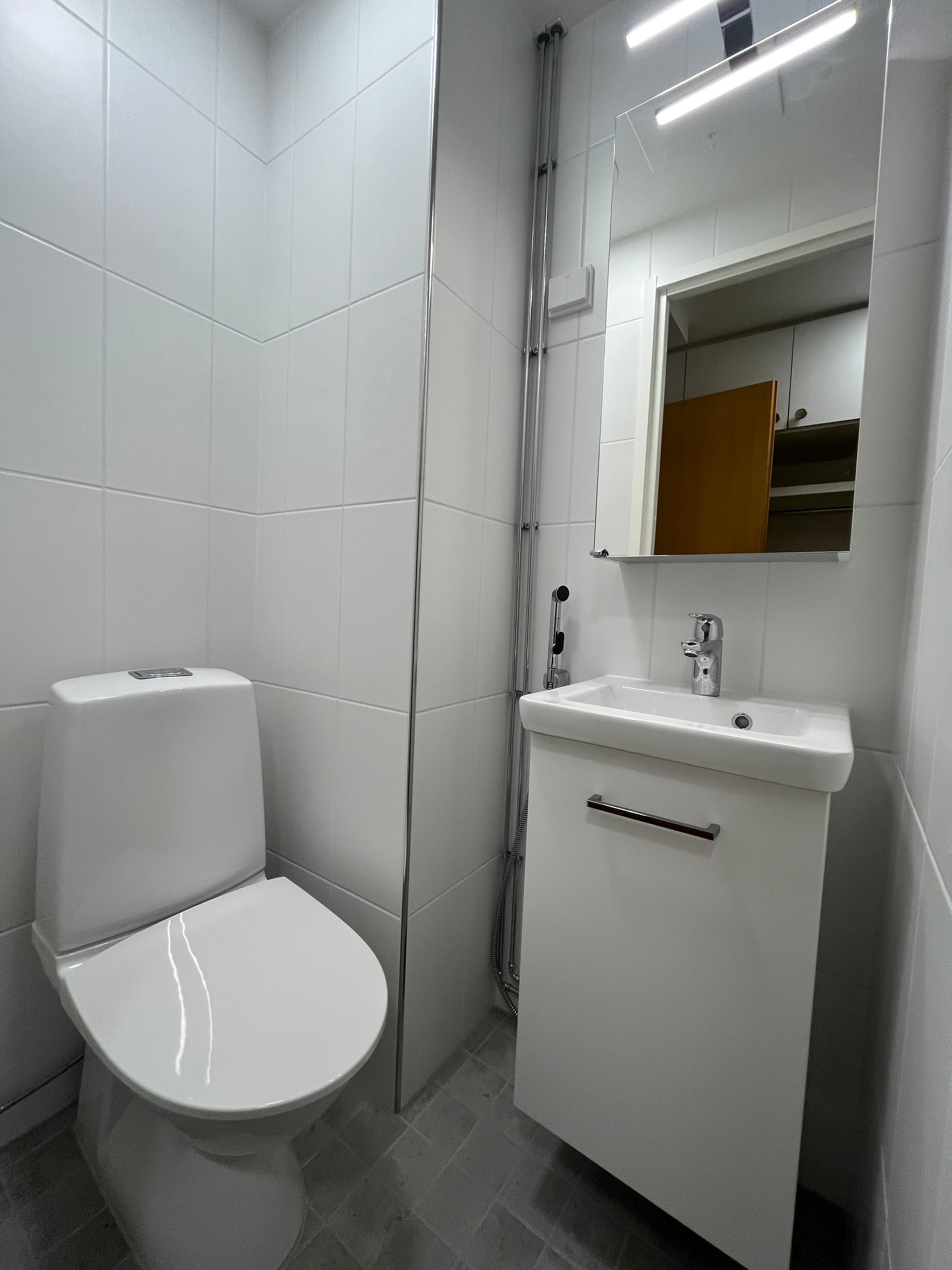 Huoneistossa on lisäksi erillinen WC, jossa on pesuallas, hana, peili, WC-istuin, seinävalaisin ja muovimatto. WC on remontoitu keväällä 2025 alkaneen linjasaneerauksen yhteydessä.