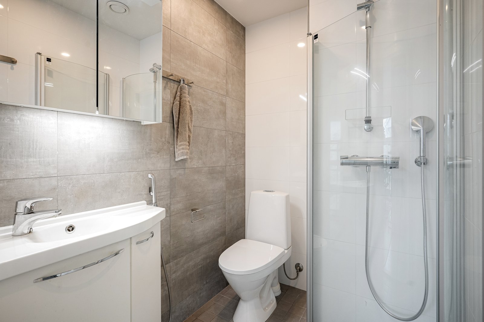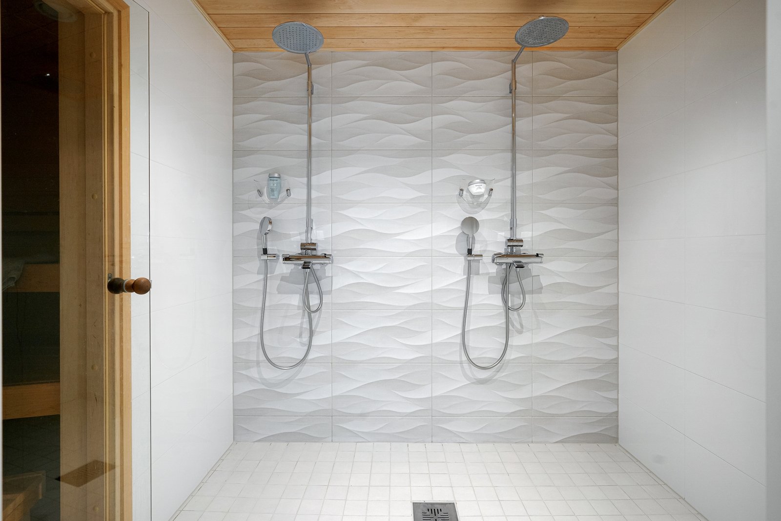 Alakerran kylpyhuone on saunaosaston yhteydessä. Laatoitetussa kylpyhuoneessa on kaksi suihkua ja lattialämmitys.