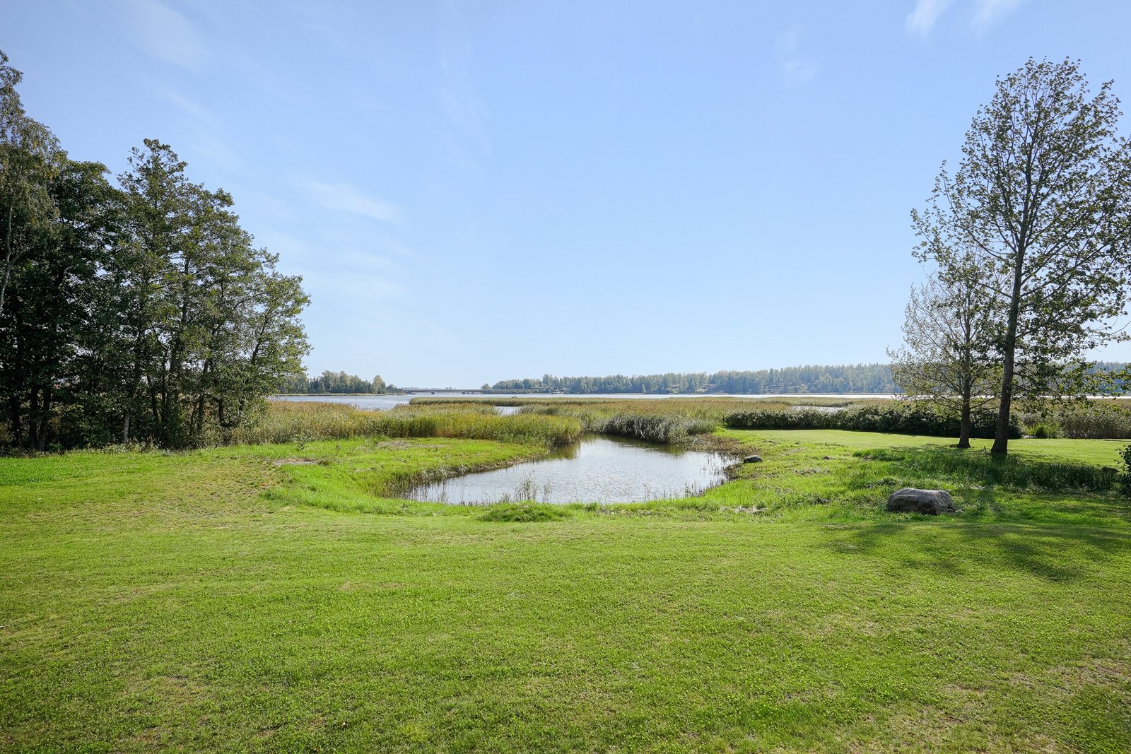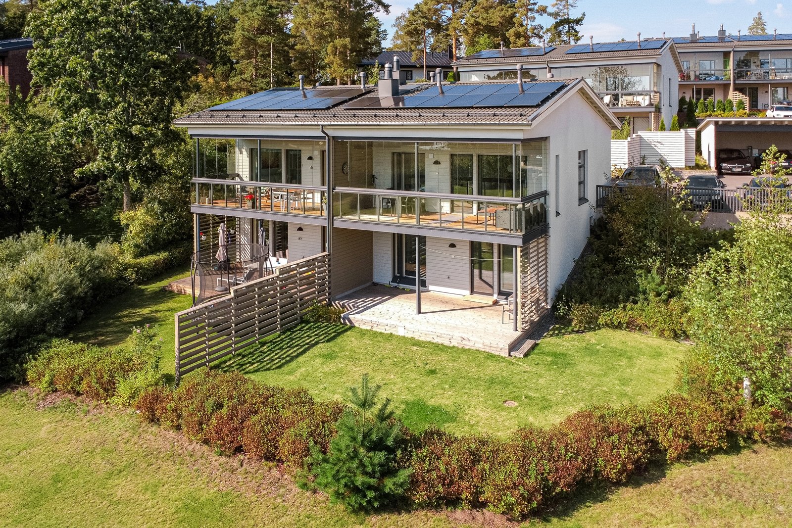 Suojaisa ja eteläinen terassipiha rajautuu merenrantaan. Takapihalla on mukavan kokoinen nurmialue pensasistutuksineen.