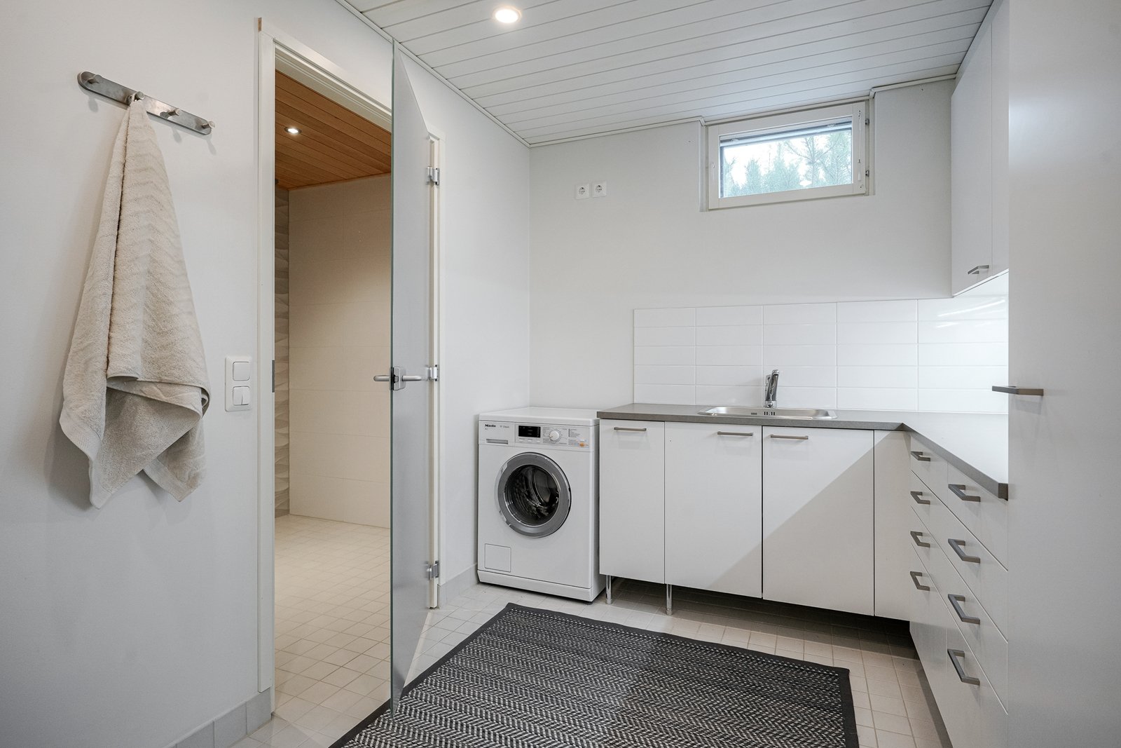 Varusteet: Tila pesutornille, pesukoneliitäntä, pesuallas, pyykkikaapit ja lattialämmitys