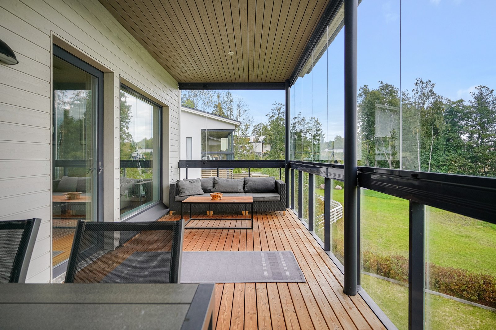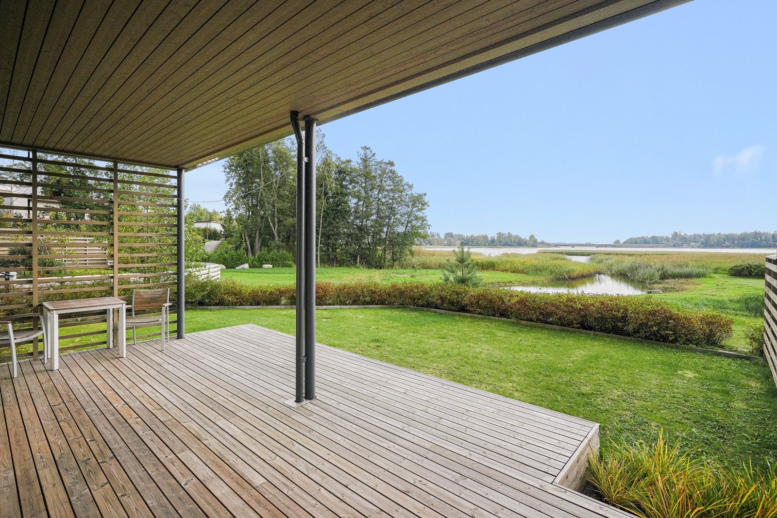 Takapihan katettu terassialue avautuu merelle.