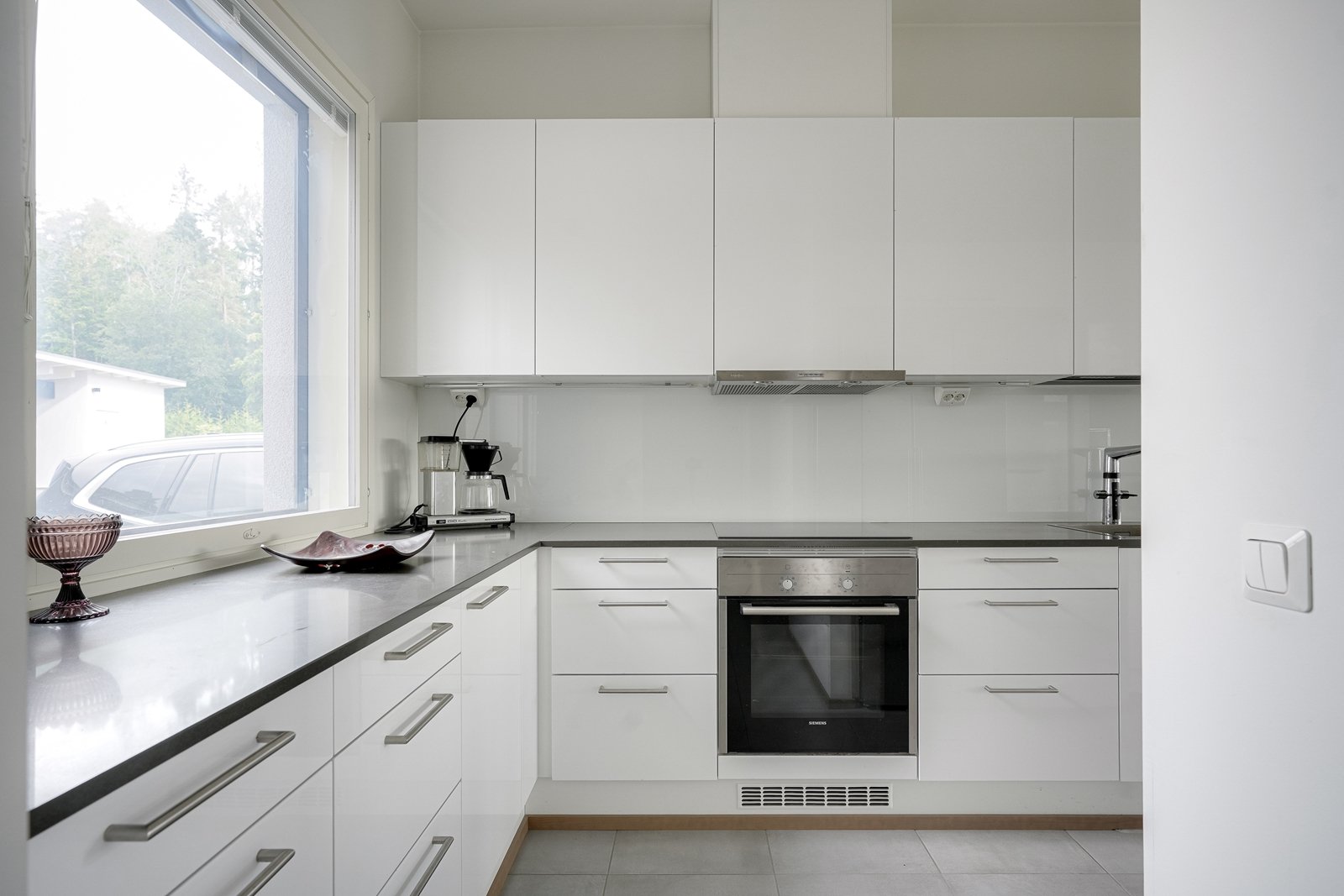 Vaaleassa keittiössä on A la Carte-keittiökalusteet, tumma kivitaso, valkoinen välitilalasi, integroitu astianpesukone (Siemens), induktioliesi (Siemens), rosterinen uuni (Siemens), rosterinen mikroaaltouuni (Siemens), rosterinen liesituuletin (Franke) ja rosteriset isot jää- ja pakastinkaapit (Siemens).