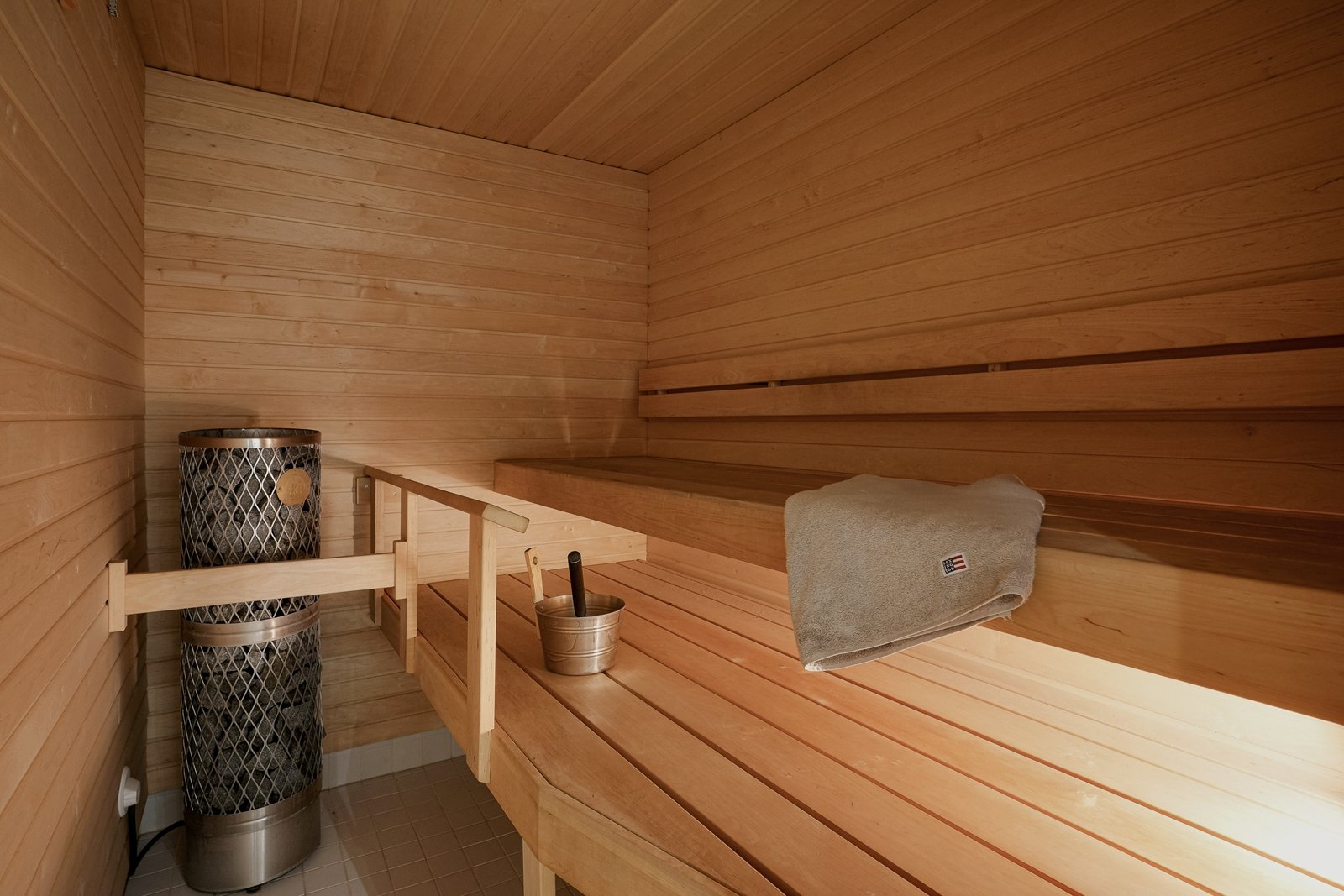 Paneloitu sauna, jossa on laattalattia ja IKI-kiuas (9 kW) etäohjauksella.