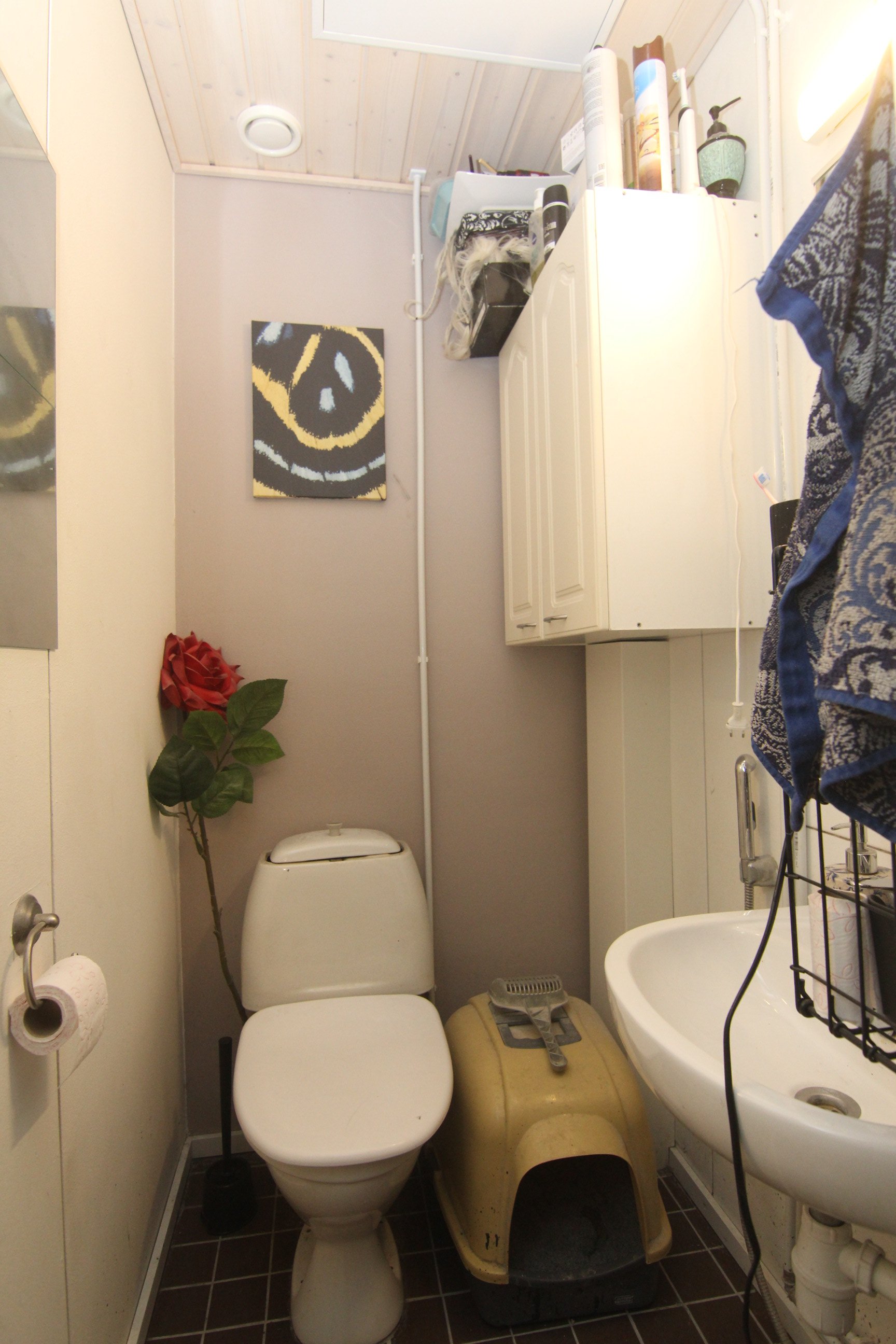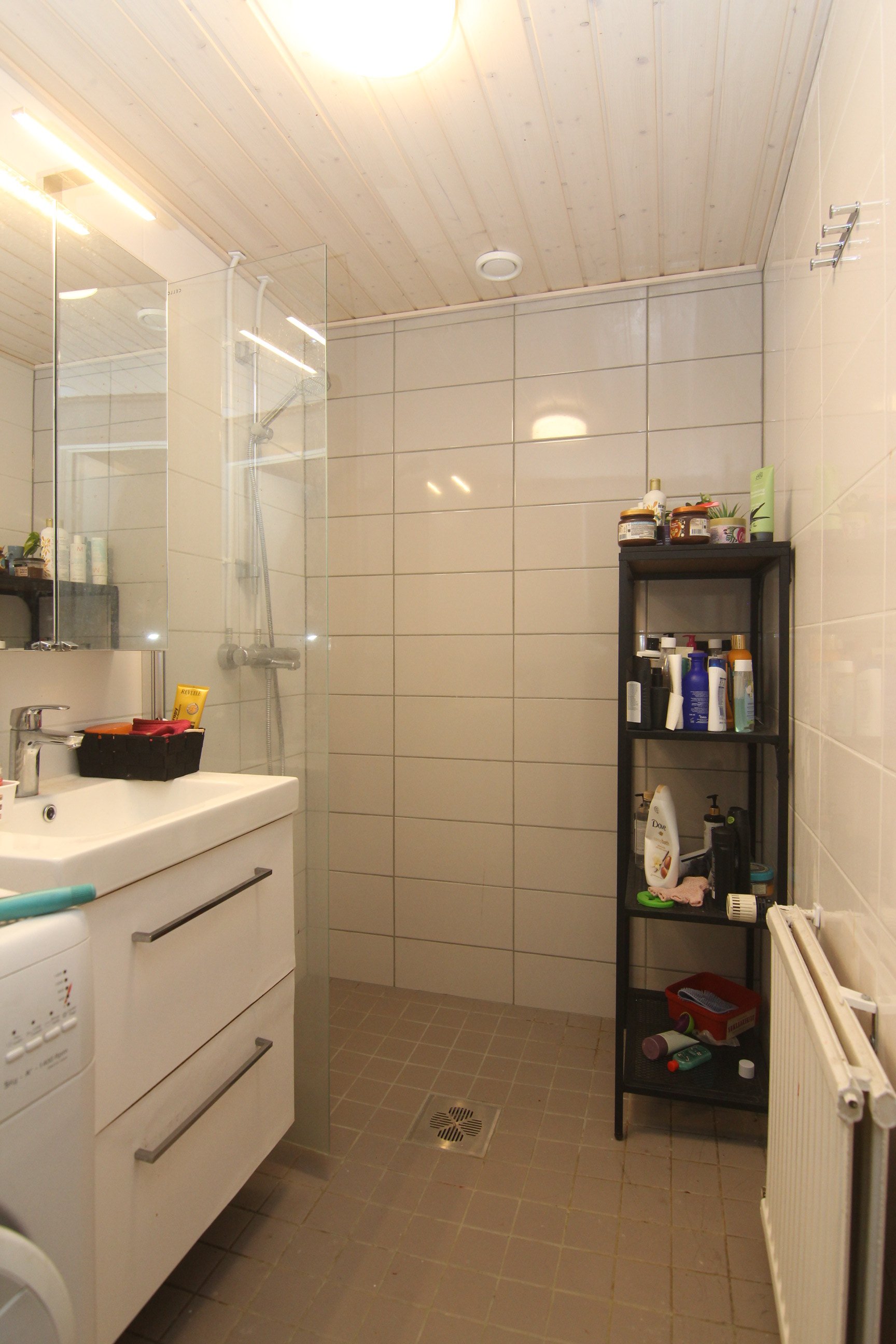 Varusteet: WC-istuin, suihku, suihkuseinä, peilikaappi, pesukoneliitäntä, allaskaappi ja pesuallas