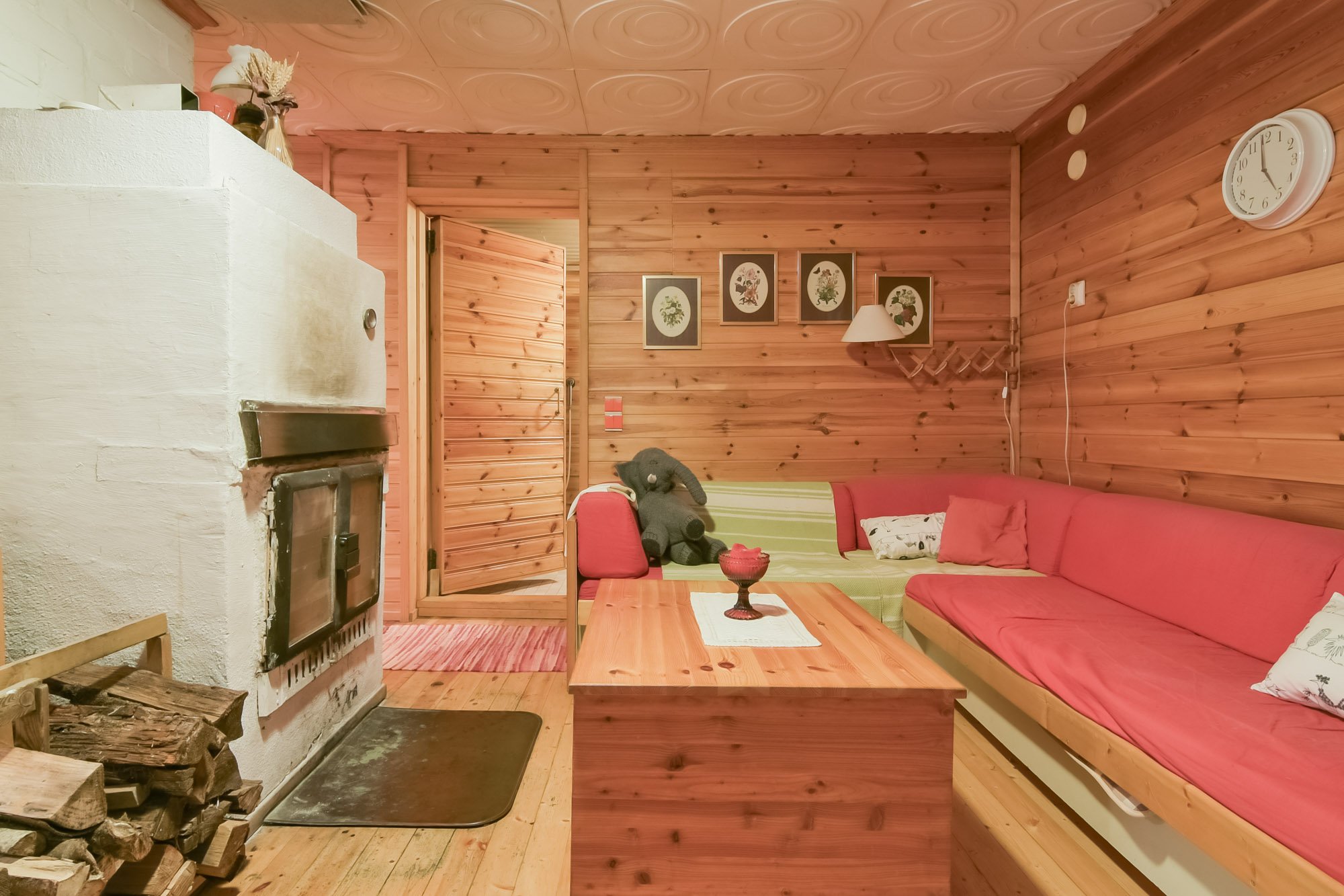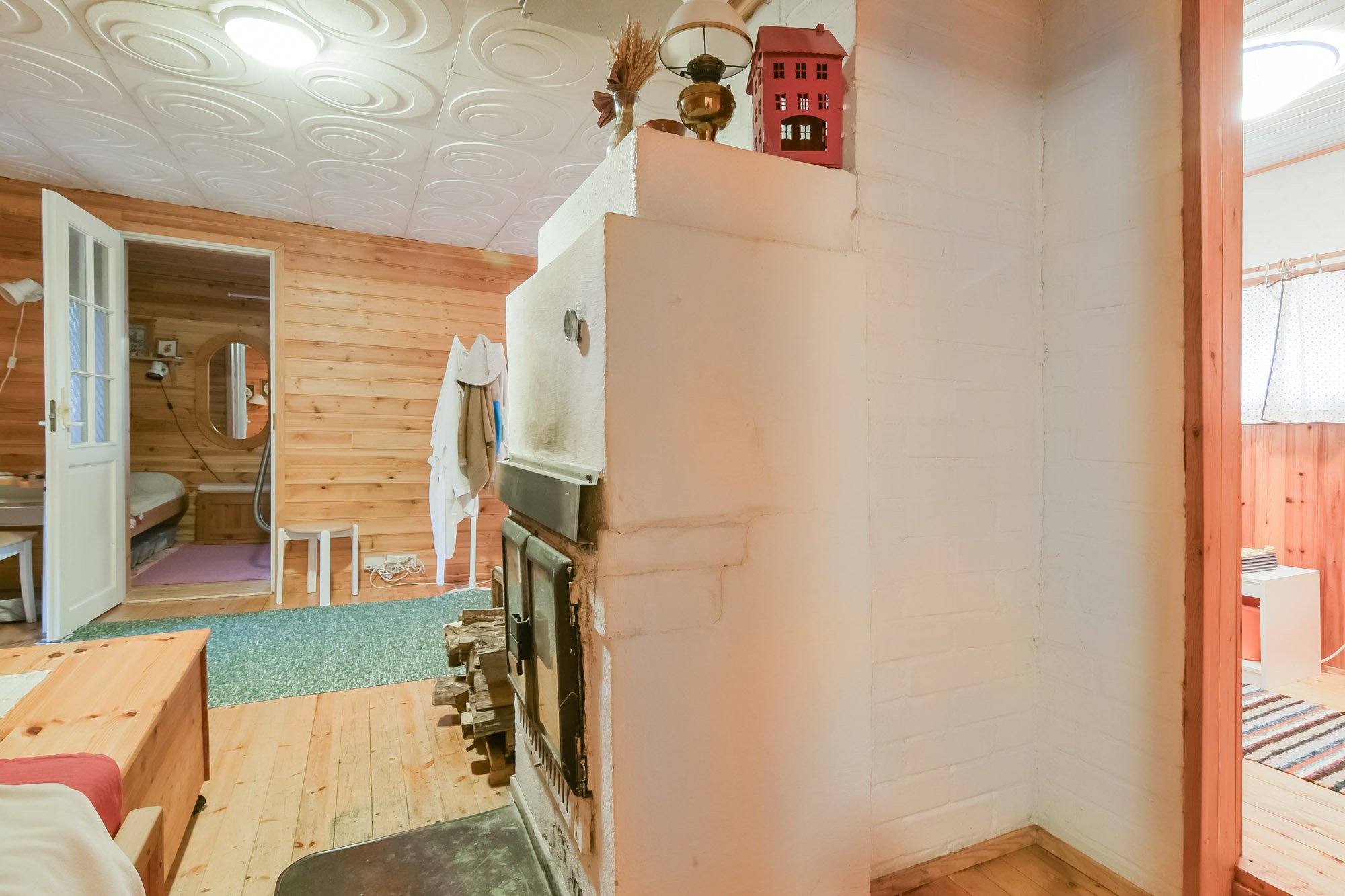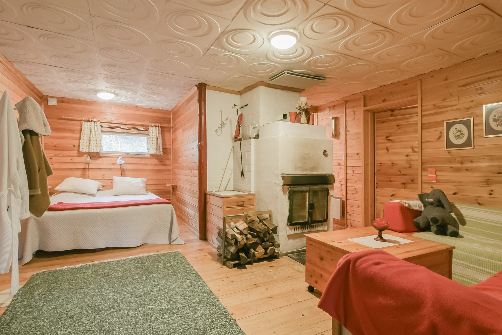 Mökissä on tunnelmallinen takka, joka luo lämpöä ja viihtyisyyttä viileinä iltoina. Lämmitysjärjestelmä koostuu puu-, sähkö- ja ilmalämpöpumpusta, mikä takaa mukavuuden ympäri vuoden.