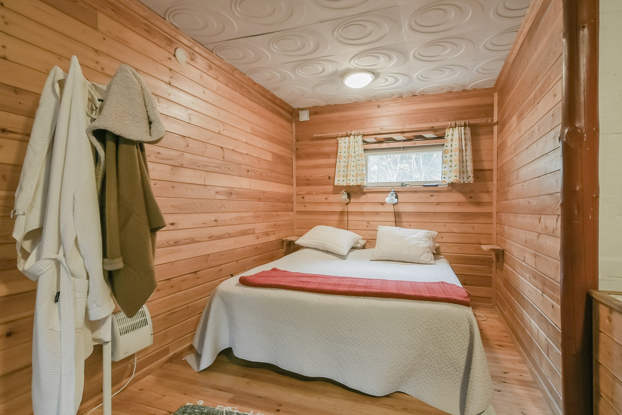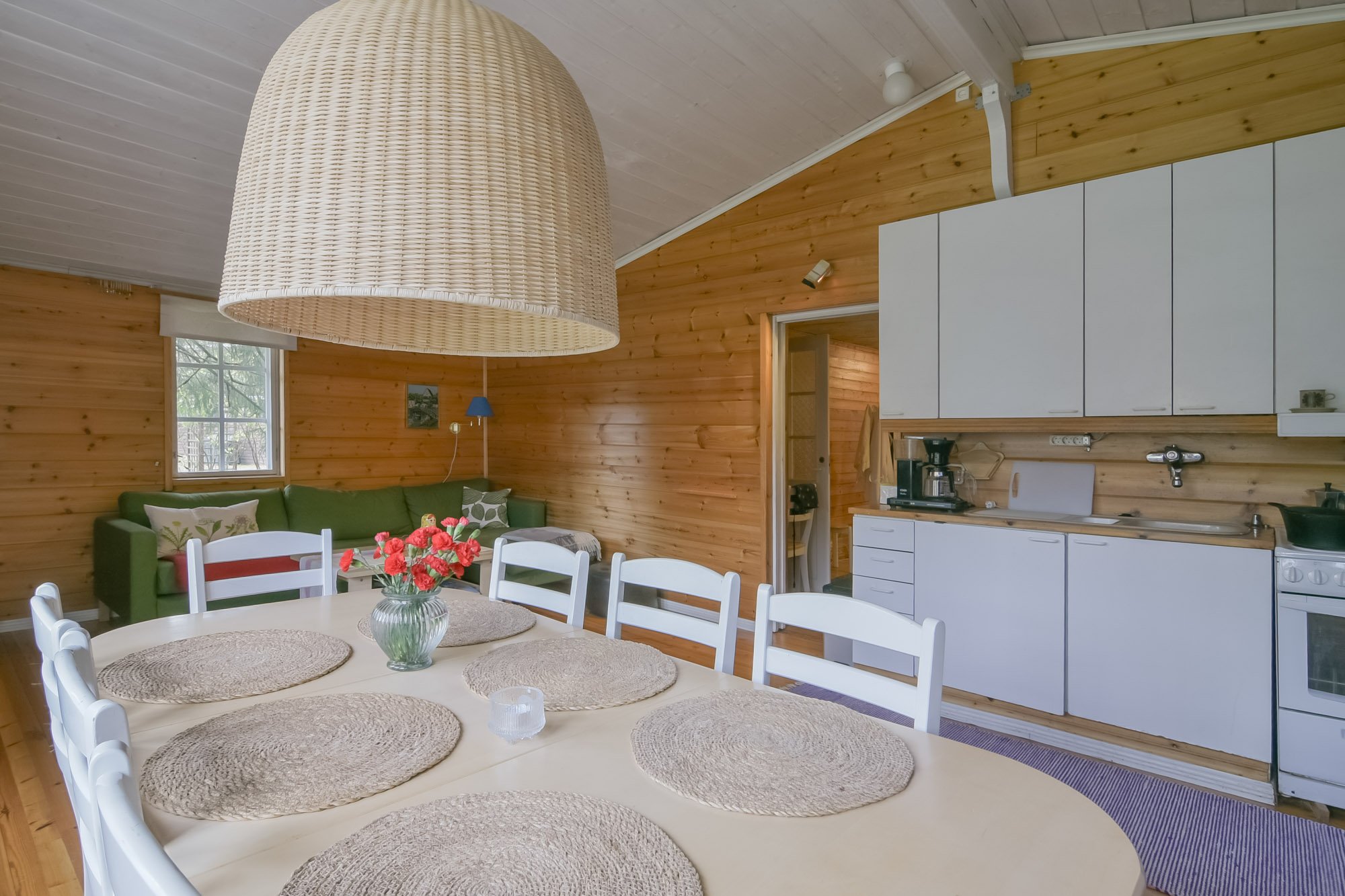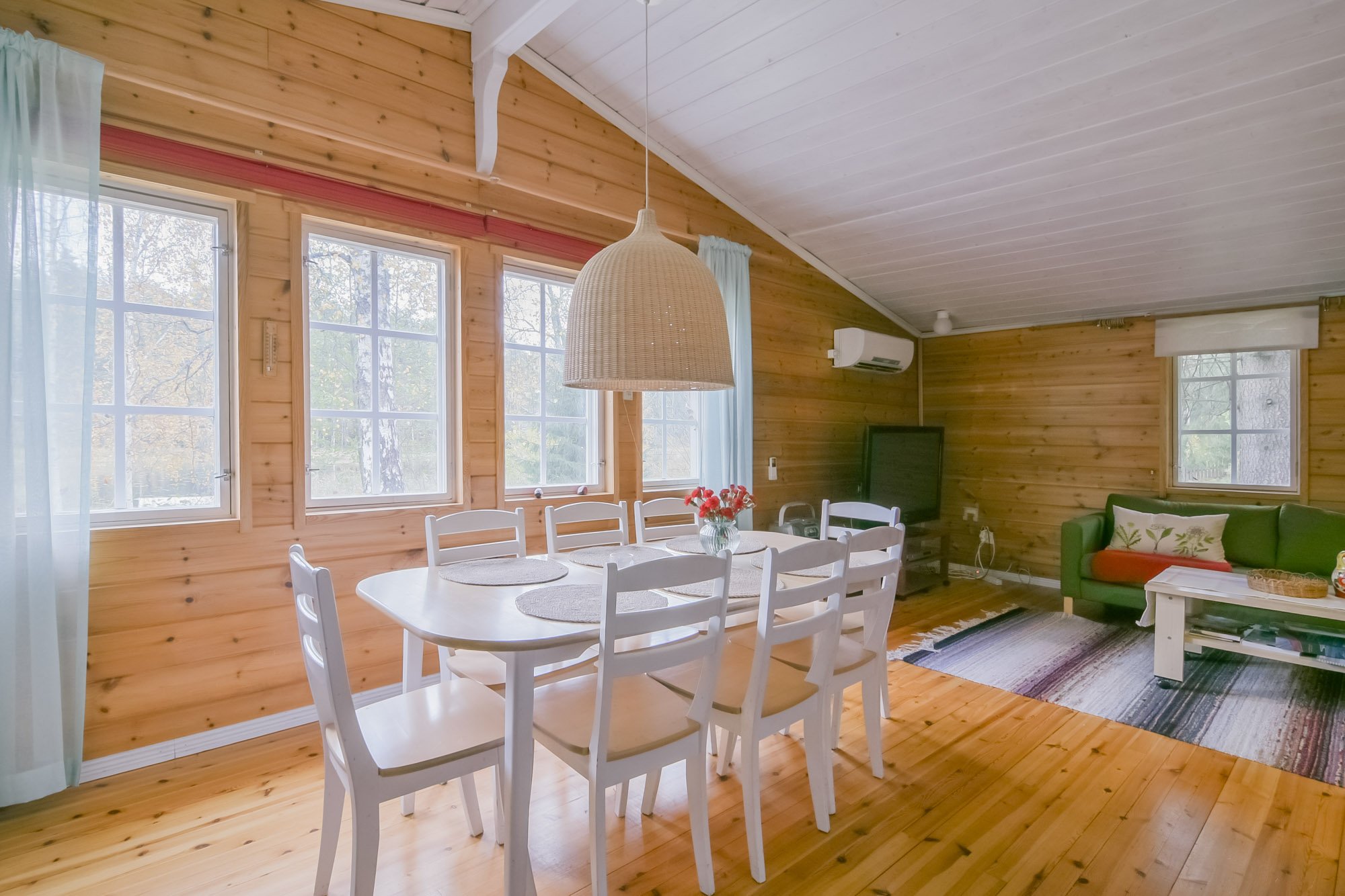 Mökissä on tunnelmallinen takka, joka luo lämpöä ja viihtyisyyttä viileinä iltoina. Lämmitysjärjestelmä koostuu puu-, sähkö- ja ilmalämpöpumpusta, mikä takaa mukavuuden ympäri vuoden.