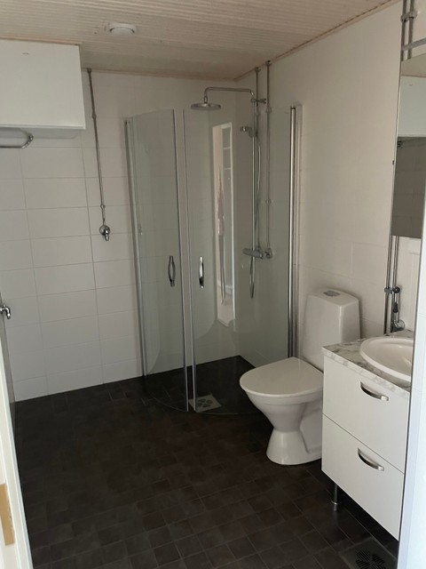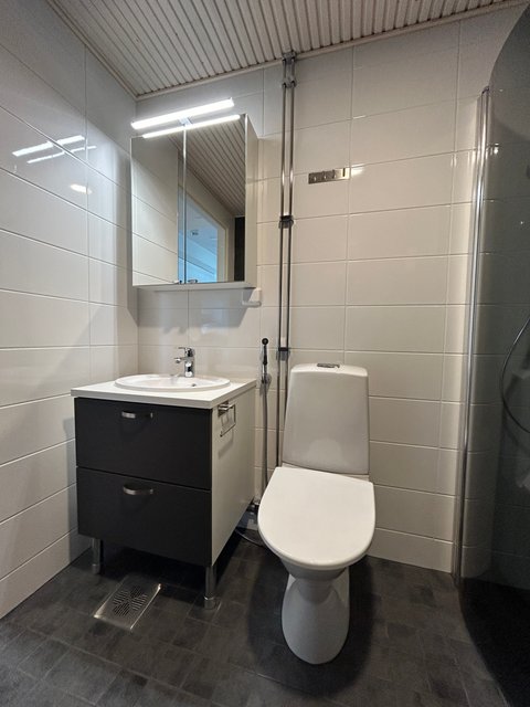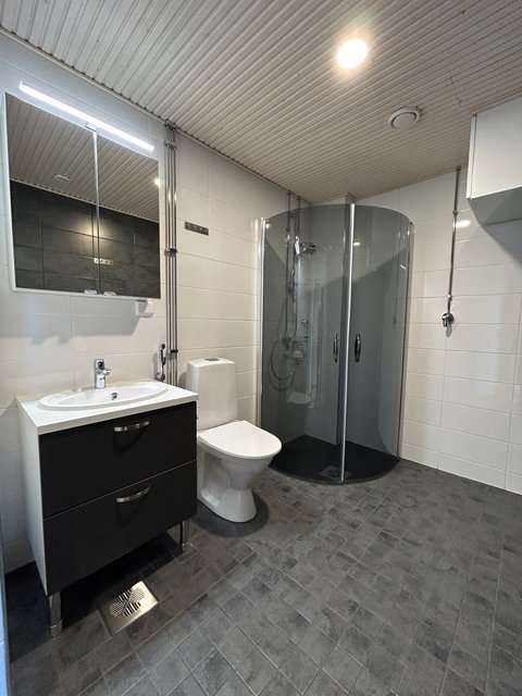 Tilavassa kylpyhuoneessa on lattialämmitys ja pesukoneliitäntä.